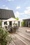 De vidsträckta fönsterpartierna ger härlig kontakt med utemiljön och det generösa och härliga trädäcket i söderläge som är närapå 300 kvm stort, omslutet av de u-formade huskropparna, ett mysigt orangeri och skyddande mur.