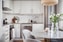 Rummets köksdel består av vita luckor och ovan den mörka bänkskivan sitter vitt kakel. Här finns gott om förvaring och all utrusning man kan kräva av ett kök; ugn, glas keramik häll, diskmaskin, mikro samt kombinerad kyl/frys.