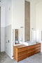 Lyxigt badrum med kalkstensgolv, delvis kaklade och delvis putsade väggar. Utrustat med vägghängd toalett, dusch, handfat med kommod, högskåp, handdukstork och infällda spotlights i taket.