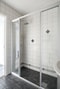Badrum: Stort helkaklat badrum i vitt och grått. Spegelskåp, vask med kommod, toalett samt handdukshållare.