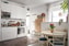 Socialt vardagsrum med öppen planlösning mot köket. Här finns plats för soffa, soffbord, tv och matplats. Fint ljusinsläpp från flertalet fönster och vackert industrigolv. Med tanke på den gedigna takhöjden om 2,8m kan man enkelt platsbygga en loftsäng över soffan om fler sängplatser skulle behövas.