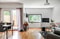 Bostaden har en öppen och genomtänkt planlösning. Det luftiga köket och vardagsrummet smälter smakfullt samman och har direkt access till uteplatsen – idealiskt för att skapa en naturlig förlängning av sällskapsdelen under sommarhalvåret.