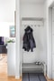 Välkomnande hall med gott om avhängningsmöjligheter. Ekparkett och vita väggar.