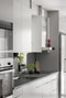 Köket är både elegant och funktionellt med ljusgrå släta luckor, varm mörkgrå bänkskiva och rostfria vitvaror som ugn, mikro, kyl och frys. Diskmaskinen är integrerad för ett sömlöst intryck. Här möts kök och vardagsrum i en öppen och luftig planlösning som bjuder in till umgänge, med gott om plats för ett större matbord och sociala tillställningar.