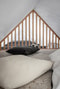 Master bedroom är något alldeles extra – öppet upp i nock med synliga takbjälkar och ett stort panoramafönster som bjuder på fri utsikt över kvarteret och himlen. En stilren glasvägg mot allrummet skapar en modern hotellkänsla samtidigt som rymden bevaras. De två övriga sovrummen, idag inredda som barnrum, har också öppet upp i nock med synliga bjälkar. En charmig och unik detalj är det gemensamma loftet som nås från båda rummen – en magisk plats för lek, läsning och fantasifulla äventyr.