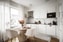 Det smakfulla köket lämnar inget att önska i varken utförande eller utrustning. Vita släta luckor som bryts av en mörk laminatbänkskiva och kompletteras av vitt kakel ovanför arbetsytorna ger en stil som aldrig går ur tiden. Maskinell utrustning består av diskmaskin, spishäll, fläkt, ugn, inbyggd micro samt kombinerad kyl och frys. Middagsbordet har en given plats intill fönstret.