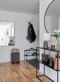 Hallen ger en ljus och välkomnande känsla åt bostaden. Väggarna är vitmålade och på golvet ligger ett mörkt klinkergolv. Klinkergolvet övergår sedan till en genomgående parkett som binder ihop bostadens samtliga rum. Hallens yta ger plats åt både hatthylla, skoställ och en förvaringsmöbel.