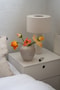 Badrummet är helkaklat och tidlöst inrett med grått klinkergolv och vita kaklade väggar. Det är utrustat med wc, handfat, väggfast förvaringsskåp och dusch med glasvägg.