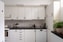 Det L-formade köket har stilrena, vita släta skåpsluckor med svarta beslag. Här finns gott om förvaring i både över- och underskåp samt generösa arbetsytor på en mörk bänkskiva som ger en elegant kontrast.
