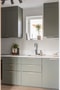 Stilrent och exklusivt kök med mörkgröna luckor och elegant bänkskiva i marmor. Köket erbjuder gott om både arbetsyta och förvaring och är utrustat med diskmaskin, kyl/frys, ugn och häll. Den öppna planlösningen mot vardagsrummet skapar en social och trivsam miljö.