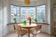 Parkettgolv och ljusa väggar. Generöst vardagsrum med vackert burspråk och plats för både större soff- och matgrupp.