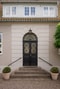 Parkera i carporten eller på den stora uppfarten. Det knastrar om gårdsgrusen på väg fram till villans entré som ligger på ena långsidan. Tre formklippta kastanjer ramar in entrésidan. Över den pampiga entréns pardörrar.