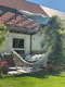 Staketomgärdad trädgård med flera uteplatser i sol och skugga, uppväxta träd, buskar och gräsmatta.