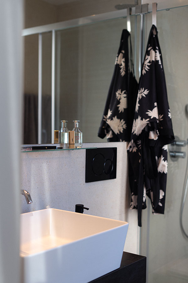 Brand new and stylish. The bathroom in Hans and Lena’s apartment.