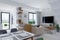 The ground floor offers a bright living room with an open-plan kitchen, two spacious bedrooms with built-in wardrobes and two bathrooms, one of which is en-suite with the master bedroom. From the living room and bedrooms you reach the garden or the sunny terrace next to the pool.