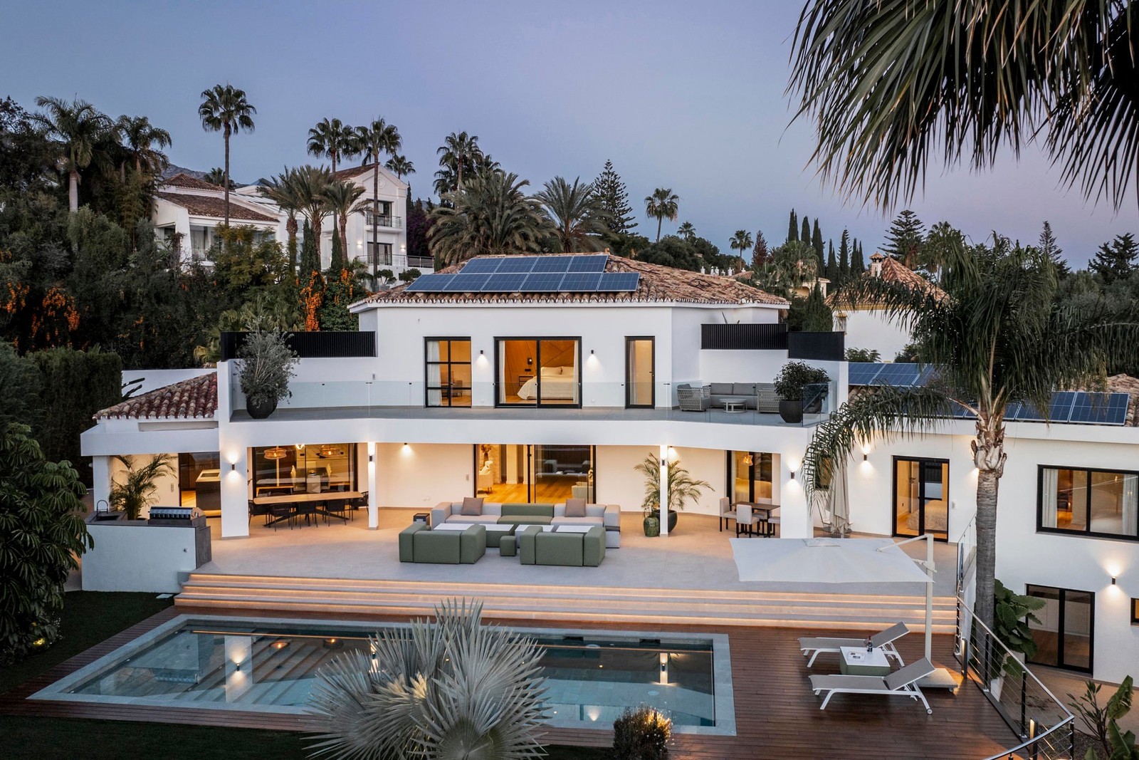 South facing. Stunning sea views. Enormous spaces. Words that define this five bedroom villa, strategically positioned on a hillside leading to Sierra Blanca on Marbella's prestigious Golden Mile. Top class schools, exceptional restaurants, and the beach are just minutes away, with Gibraltar visible from the windows thanks to the villa's south facing position. This also ensures sunlight all day long, along with stunning sea views.
