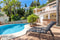 Garage for one car and indoor parking for two cars. Garden with pool and open bar as well as relaxation area with barbecue.