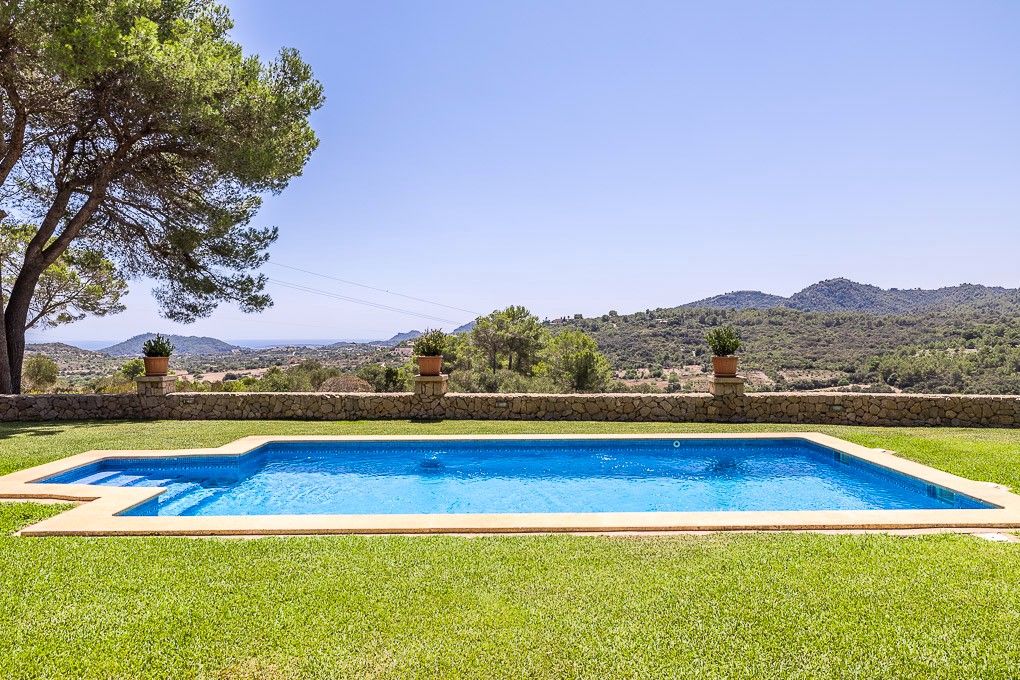 The 300 m² living space includes six bedrooms, three bathrooms, one of which is en suite, a spacious kitchen with dining area, an open-plan living room and, on the upper floor, a gallery with a pool table, a guest toilet and a roof terrace. From the large terrace on the ground floor you can enjoy lovely views of the 50 m² saltwater pool and views towards the sea. Additional amenities on the estate include a garage for two cars, an outdoor garden and a chicken coop. The property is connected to the mains electricity supply and has two private wells and a water cistern with a capacity of 80,000 litres. Oil-fired central heating and two fireplaces ensure pleasant temperatures all year round. The plot is adorned with typical Mallorcan vegetation and is completely surrounded by walls, giving a feeling of privacy and tranquility.