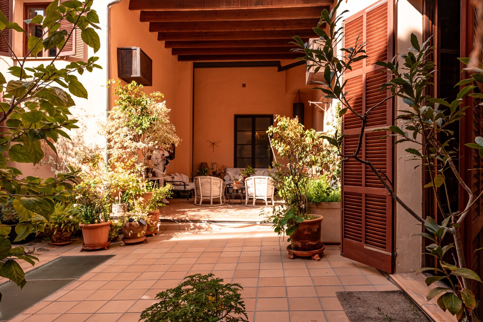 You are first welcomed to a traditional communal courtyard with charm and elegance, from which stairs lead up to the apartment. The apartment boasts high ceilings and an open floor plan that provides a sense of space and freedom. Beautiful wooden beams and high-quality wooden floors adorn the entire home. The large L-shaped living room with dining area has a very generous ceiling height and lovely wooden doors that open onto a 110 m² private terrace with both covered and open sections. This oasis is also accessible from the stylish and spacious kitchen, equipped with an island and space for a breakfast table.