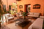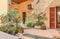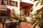 The terrace is a cozy outdoor environment, currently nestled in lush greenery, with hanging planters adorning the walls. In the center, there is a seating arrangement with a table and several chairs, perfect for relaxation or social gatherings. The terrace has wooden beams on the ceiling and is surrounded by walls painted in a warm, earthy tone. An inviting setting for outdoor dining.