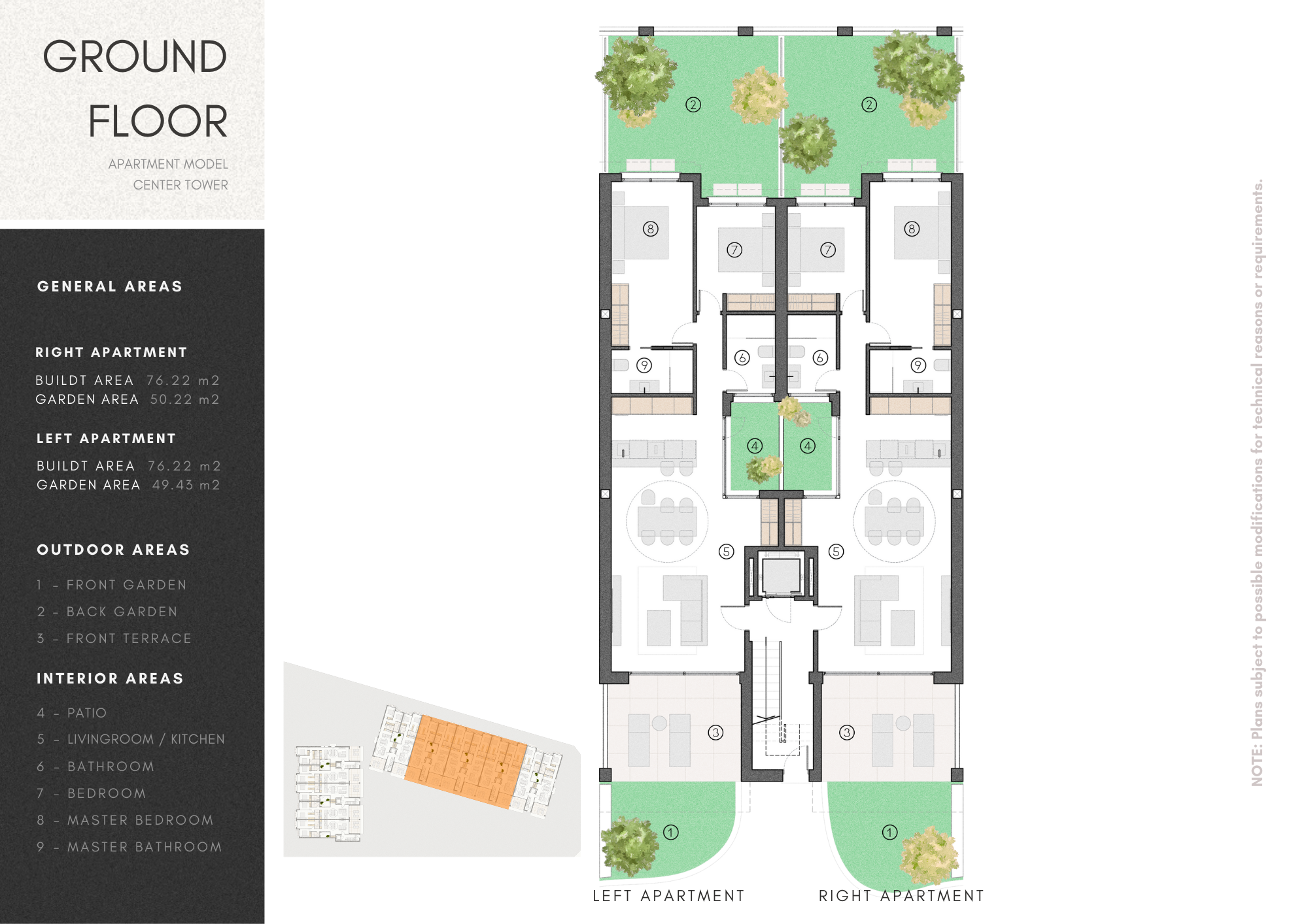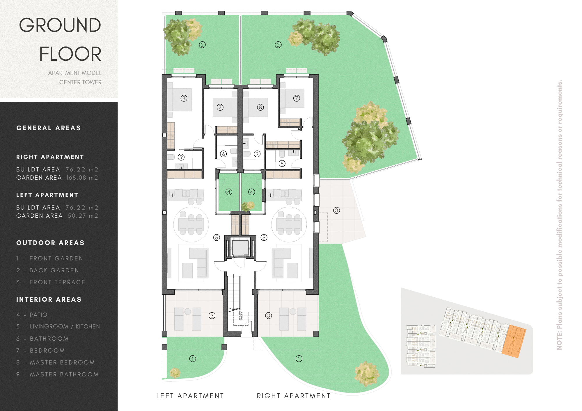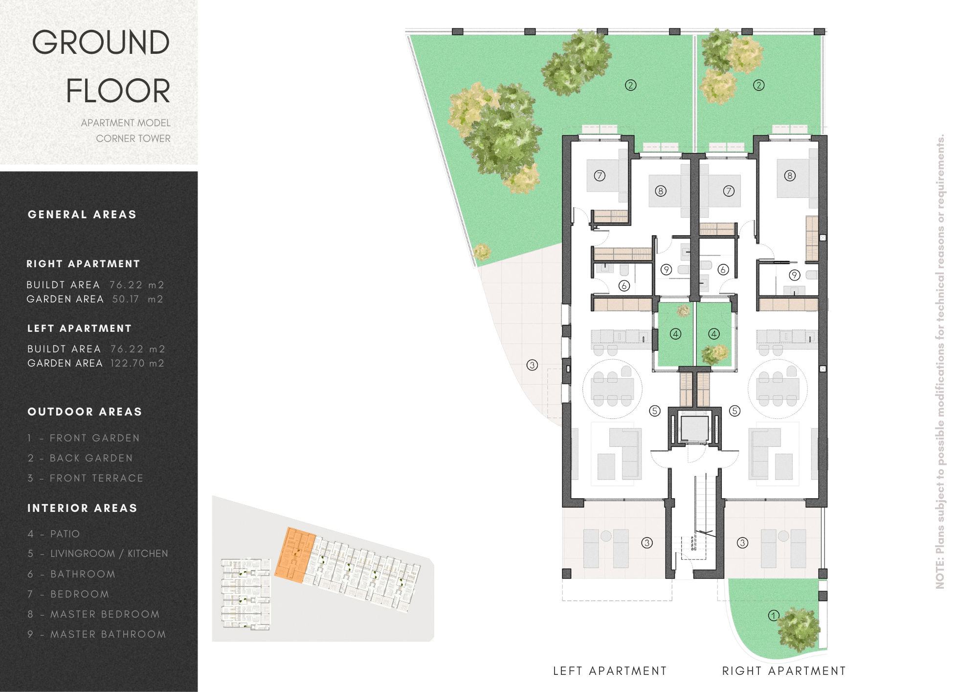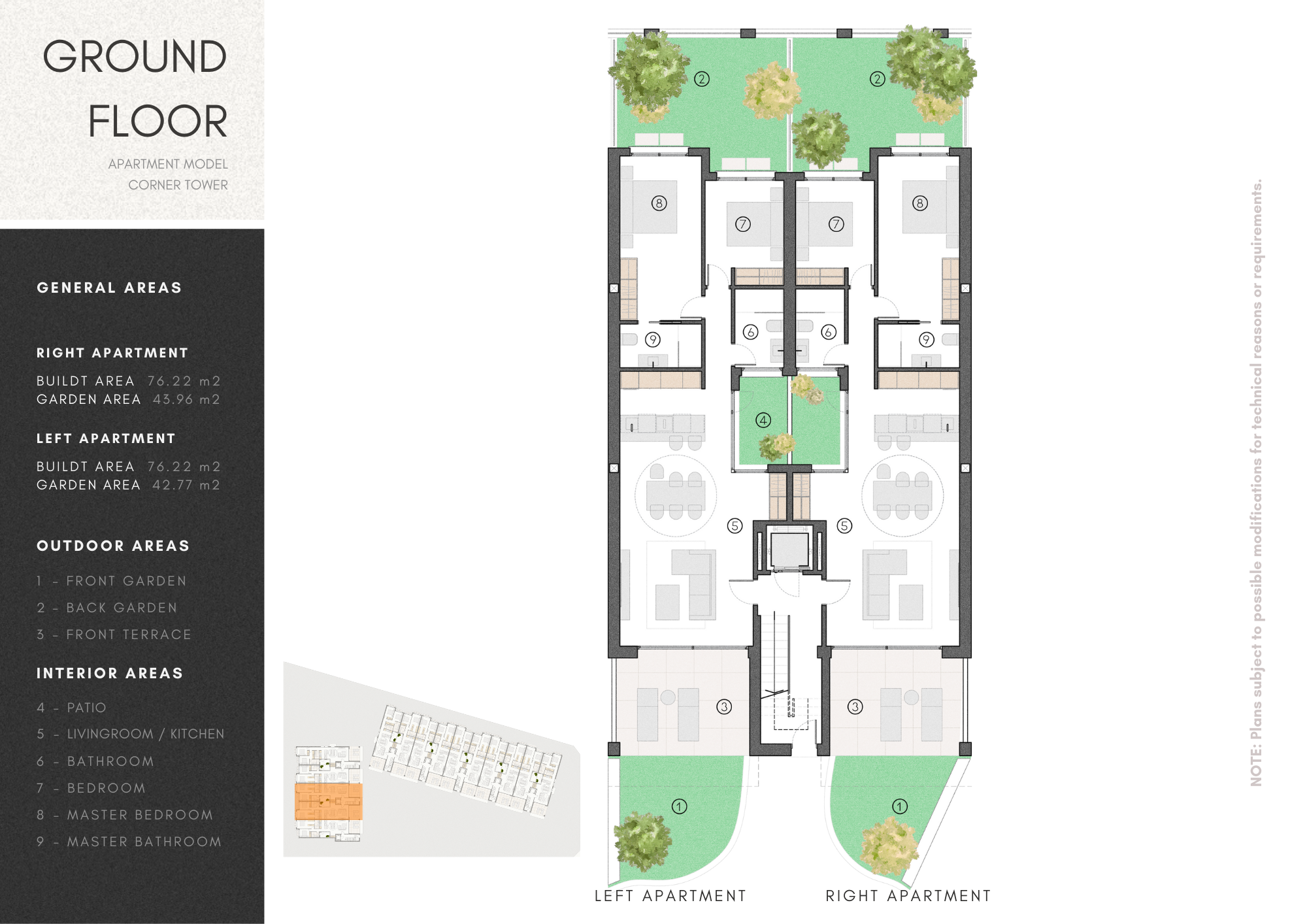 The ground floor units offer two spacious bedrooms with fitted wardrobes, two bathrooms, one en-suite with the main bedroom, and seamless access to several terraces and a private garden, perfect for outdoor relaxation.