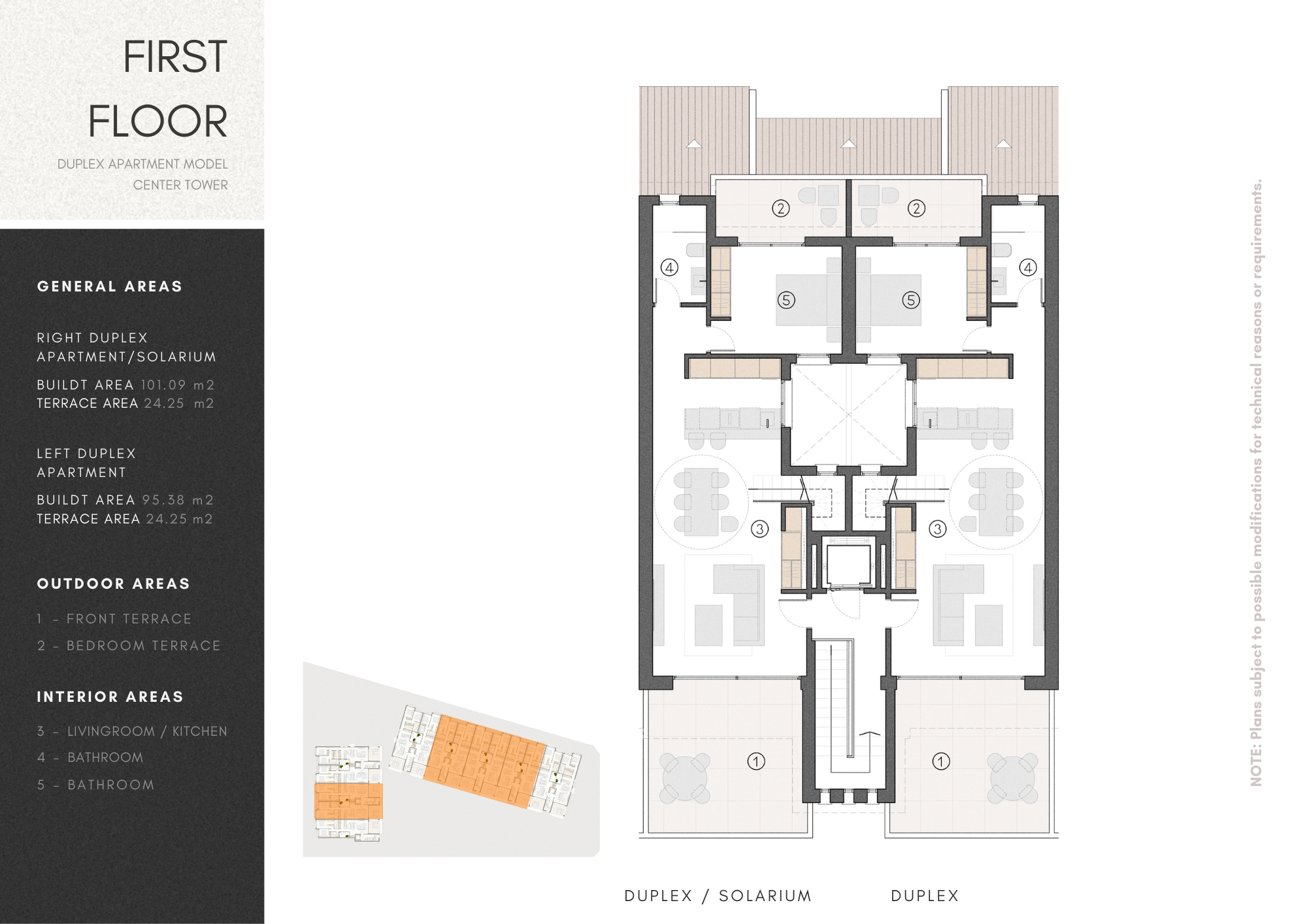 Top-floor apartments are spread over two levels: the main floor features the living room, kitchen, one bedroom, and a bathroom, while the upper floor includes two more bedrooms, two bathrooms (one en-suite to the main bedroom), and cozy balconies, culminating in a stunning rooftop terrace ideal for sunbathing, dining, and enjoying the views.