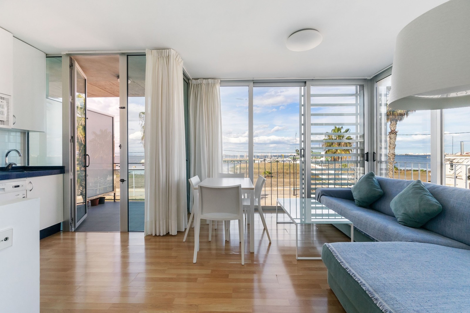 The apartment features three bedrooms and two stylish bathrooms, making it perfect for both permanent living and as an exclusive holiday retreat. The open-plan social areas seamlessly integrate the kitchen and living room, creating a harmonious layout that invites both relaxation and entertaining. From the spacious glass windows in the living room, you can enjoy the natural light streaming in and a panoramic view of the blue waters of Mar Menor. There's also space for a dining table where you can enjoy meals with the sea as your backdrop.