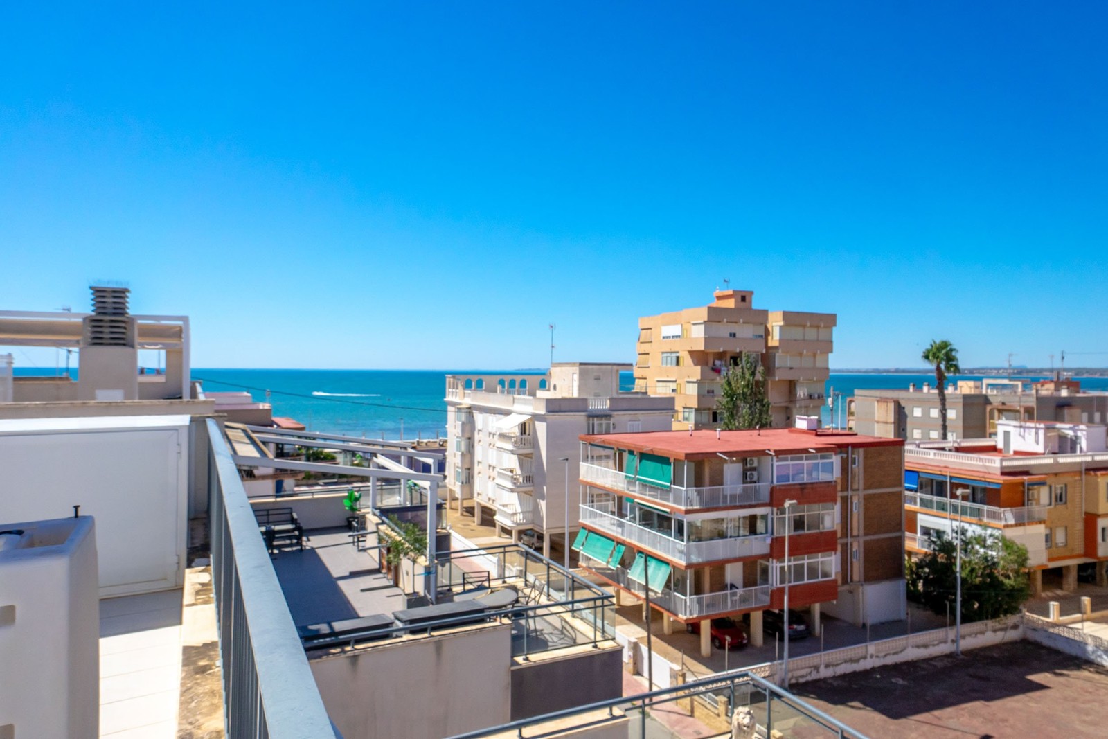 Desde la terraza trasera, orientada al este, se accede a la azotea privada tipo solárium, un espacio exclusivo con espectaculares vistas al Mediterráneo, zona chill-out con sofás, tumbonas, barra de bar y ducha, ideal para relajarse y disfrutar del clima.