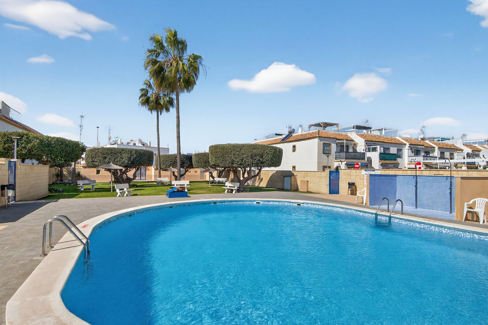 La vivienda también incluye acceso a una zona de piscina compartida muy agradable, con amplias zonas verdes, tumbonas y una piscina recientemente renovada.