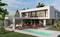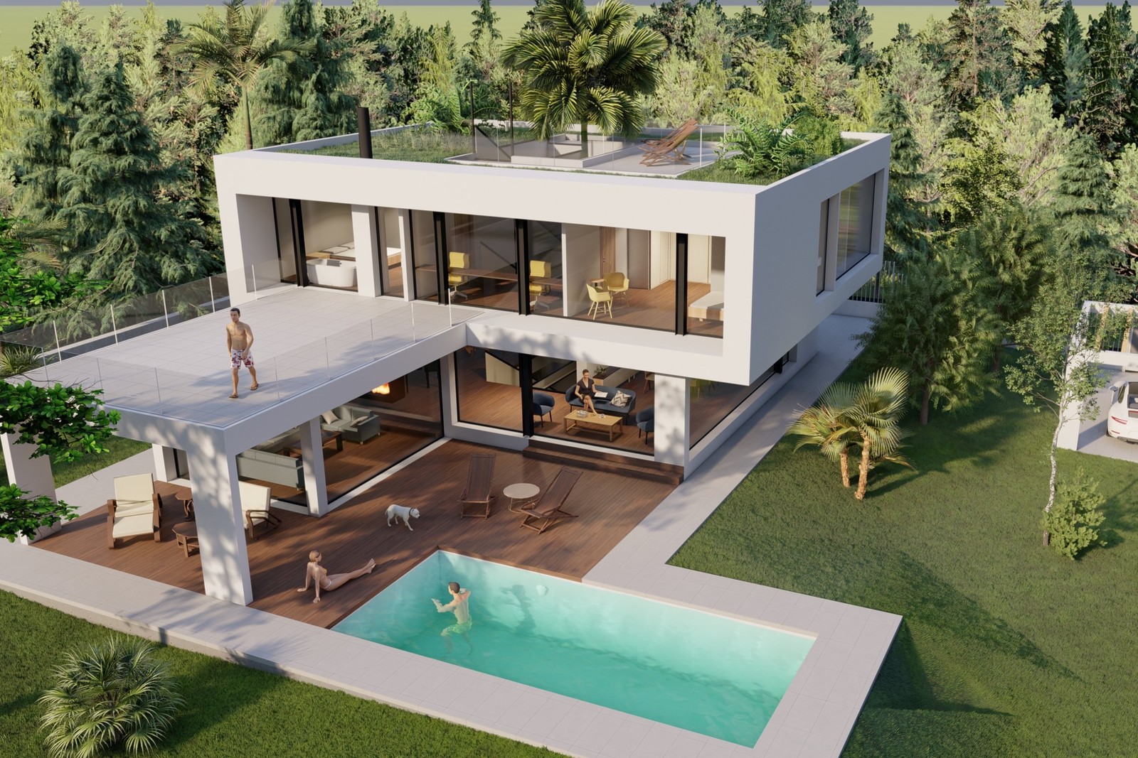 La villa consta de 400 m2 y está construida sobre una parcela de 1428 m2. Además del jardín y la piscina infinita también habrá aparcamiento cubierto para varios coches.