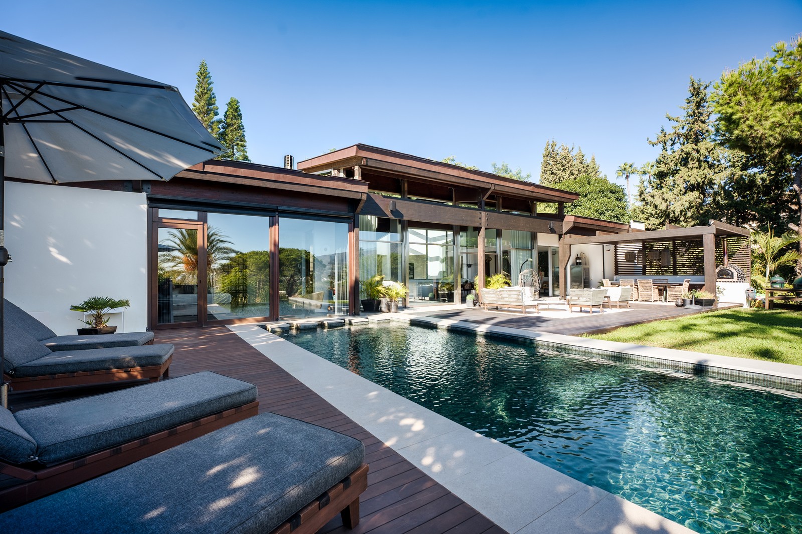 La villa está ubicada en una amplia parcela de 1.643 metros cuadrados y está bañada por luz natural, con ventanas de piso a techo que enmarcan impresionantes vistas de la montaña La Concha, el campo de golf y el mar Mediterráneo. El elegante diseño, con vigas de madera y múltiples terrazas, combina a la perfección estilo y funcionalidad.