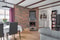 Trägolv och vitmålade väggar. Tegel vid den öppna spisen