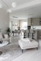 Magiskt vardagsrum med generöst ljusinsläpp via stort fönsterparti (skjutbart). Ytskikt i elegant kulör samt enstavsparkett (Tarkett Shade ek snow flake). Värmande kamin från Nordpeis. Perfekt avvägd öppen planlösning. Belysning via infällda spotlights.