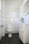 Ljus entré med separat gäst-WC i anslutning. Klinkerbelagt golv samt halvkaklade väggar. Naturligt ljusinsläpp via fönster. Utrustning i form av väggskåp, handfat med kommod samt WC.