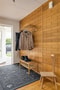 Hall: Villans ljusa och öppna atmosfär möter dig redan i hallen. På golvet ligger ett parkettgolv och väggarna är vitmålade. Den vackra fondväggen klädd i träpanel gör att hallen ger ett varmt och inbjudande intryck. Direkt till vänster om entrédörren finns plats för hatthylla och skoställ.