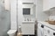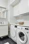 Helkaklat badrum med mörk klinker och vitt kakel. Badrummet är utrustat med WC, tvättställ med kommod och spegelskåp med belysning och förvaring. Duschen har duschdörrar i frostat glas. Den praktiska tvättavdelningen är utrustad med en kombinerad tvättmaskin och torktumlare samt en extra torktumlare. Här finns även en tvättbänk samt överskåp för förvaring att tillgå.