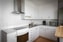 Fortsätter man längre in i lägenheten finner man köket. Det är ett praktiskt arbetskök med gott om förvaring bakom de vita luckorna. Ovan arbetsbänken sitter vitt kakel. Den maskinella utrustningen består av spis, ugn, spisfläkt samt kombinerad kyl/frys. Intill fönstret finns även plats för ett mindre matbord.