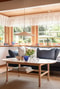 Björkparkettgolv och målad tapet. Braskamin. Ett härligt rum med plats för soffgrupp. Fönstervägg ut mot terrassen och trädgården.