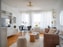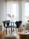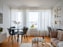 Öppen planlösning mot kök med parkettgolv och vita väggar. Här finns plats för båda matbord och soffa. Ett stort fönster och fransk balkong med dörr helt i glas.