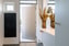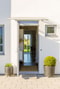 Besökare hälsas välkomna in i en rymlig entré med gott om plats för att hänga av sig ytterkläder och skor. På höger sida finns extra klädkammare med förvaringsutrymme under trappan. Golvet täcks av praktisk klinker som övergår till ekparkett och sträcker sig genom bostaden. Väggarna är målade i vitt.