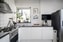 L-format kök med vita skåpsluckor. Maskinellt utrustat med kyl och frys side-by-side, gasspis och ugn med fläkt ovan. Mikro, integrerad diskmaskin, rostfri ho och mörk stenbänkskiva med vitt kakel ovan. Goda förvaringsmöjligheter bakom flertal skåp samt gott om arbetsyta.
