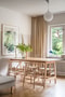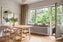 Välplanerat och rymligt kök med generösa arbetsytor och utmärkta förvaringsmöjligheter tack vare flera över- och underskåp. De ljusa, trätonade skåpsluckorna med tidstypiska beslag kompletteras snyggt av en grå bänkskiva och matchande kakel. Köket är utrustat med moderna vitvaror i rostfritt stål, inklusive stor kyl och frys, diskmaskin, spis/ugn och fläkt. Två fönster i fil ger ett behagligt ljusinsläpp, och väggarna har målats i ljusa nyanser som harmoniserar med det vackra furugolvet.