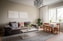 Vidare öppnar hallen upp mot ett generöst vardagsrum med plats för både soffgrupp, matsalsbord och läshörna. Väggarna är målade i en mjuk grå/beige ton som harmoniserar vackert med vitmålade lister och. Taket ramas in av en bevarad rosett – en detalj som återkommer i flera rum och bidrar till lägenhetens unika känsla.