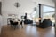 i öppen planlösning till köket där vardagsrummet över vilket imponerar med sitt ryggåstak och dubbla takhöjd. Enastående ljusinsläpp med stora fönsterpartier mot baksidan där det även finns en andra helglasad dörr till uteplatsen. Braskaminen blir en mittpunkt där det finns plats för både större sittmöbel och matplats.