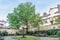 Gemensam uteplats på innergården med trädgårdsmöbler och grill.