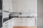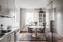 Köket är stilrent och modernt med rostfria vitvaror och plats för matbord intill fönster. Den delvis öppna planlösningen mot vardagsrummet skapar en ljus och luftig känsla, idealisk för umgänge och vardagsliv.