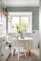 Invid fönstret är den härliga matplatsen för 4-6 personer placerad. En sittbänk som är byggd i samma stil som resterande köksinredning, ger extra förvaring samt flertalet sittplatser. Väggarna är klädda till hälften med kakel i halvförband samt en vacker tapet från William Morris med ett organiskt mönster i harmoniska kulörer.