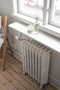 De vackra brädgolven fortsätter in i vardagsrummet, som flödar i naturligt ljus från två spröjsade fönsterpartier. Detta är ett stort och socialt rum där både soffgrupp, tv-möbel och ett större matbord får plats. Ett bevarat gjutjärnselement och de klassiska listverken förstärker husets tidstypiska charm.
