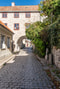 Ståtligt medeltidshus i gotländsk kalksten med valv över gränden, havsutsikt och en härlig trädgård