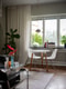 Lättmöblerat rum med gott om plats för en rejäl soffgrupp såväl som övrig möblering och trevlig sovavdelning via loft. Med härligt ljusinsläpp från stort fönsterparti med tidstypisk djup nisch och fönsterskiva i sten.